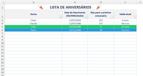 como fazer uma planilha com datas de aniversariantes no excel